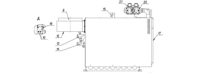 13. Патрубки отопления (подача) 14. Патрубки отопления (обратка) 15. Транспортировочные проушины 16. Сливная пробка 17. Дверка 18. Глазок для контроля пламени 19. Предохранительный клапан 20. Штуцер для замера давления газа 21. Регулятор давления газаы |